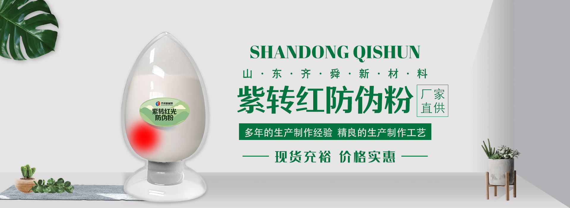 我公司前身為2011年成立的淄博舜明熒光科技有限公司。隨著公司的發展,廠址從淄博搬遷到青島,2020年5月公司重新注冊為山東齊舜新材料有限公司。公司注冊資本2000萬元,主要從事新材料研究和開發。目前主要產品包括:農膜用轉光粉、轉光母粒以及轉光農膜;農膜用長效防霧流滴涂覆液;復合肥添加劑及葉面肥(稀土微肥);防偽粉;LED封裝熒光粉;夜光粉;太陽能光伏電池增效熒光粉;鋰電池正極材料等。